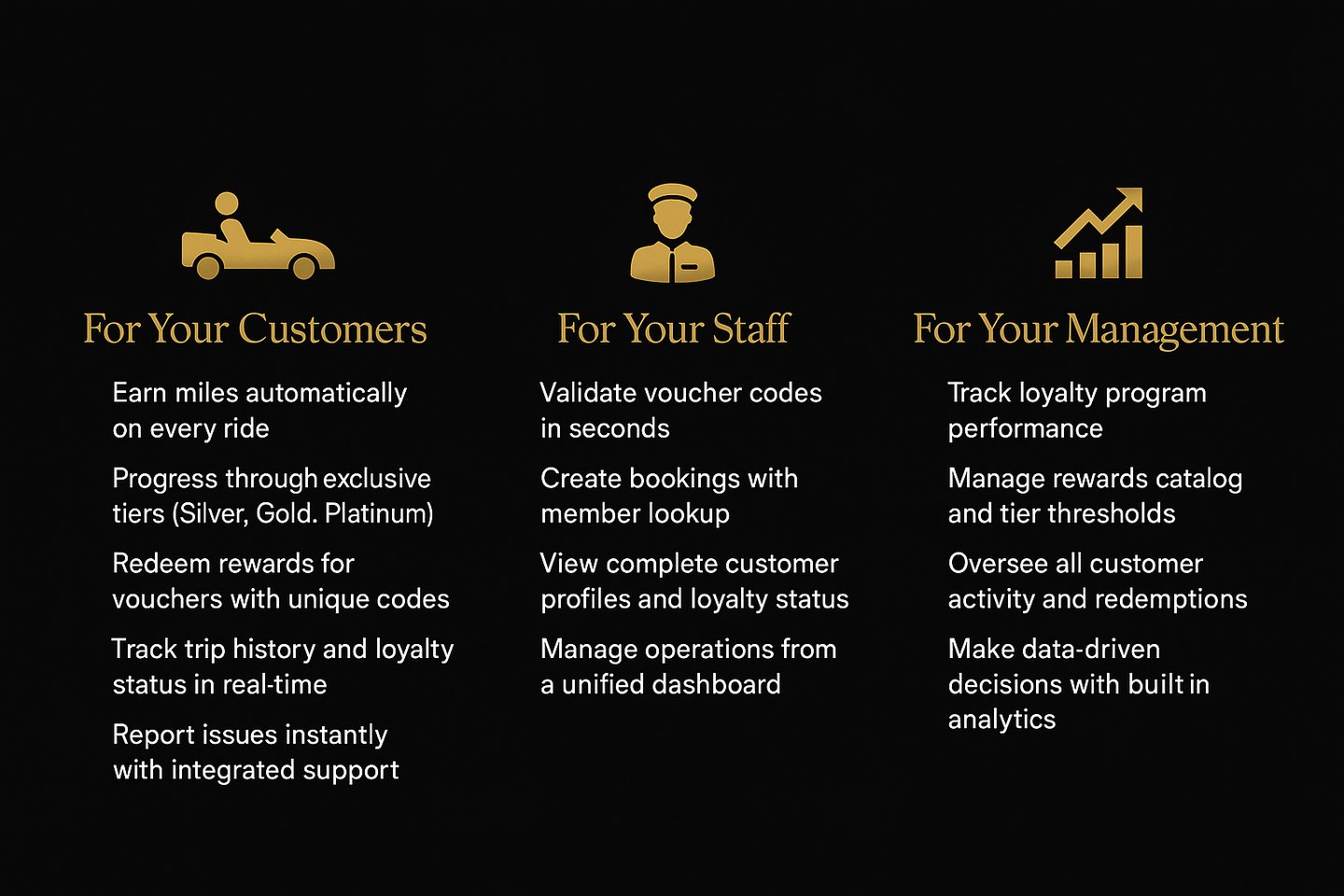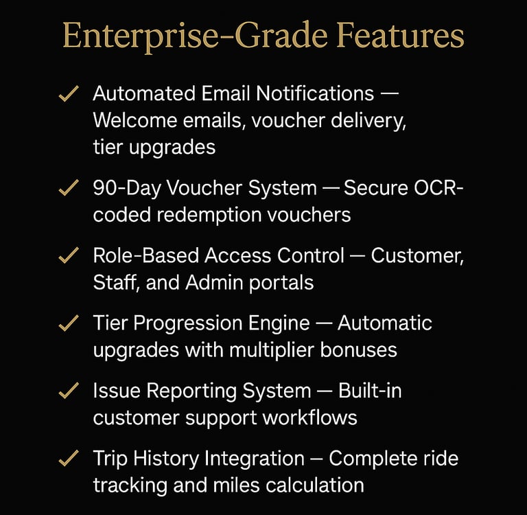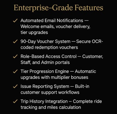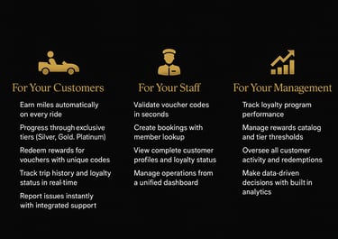 Our platform embodies the sophistication your clientele expects — an ultra-luxury dark palette, premium gold accents, and an interface inspired by the world’s finest airline and hotel loyalty programs.